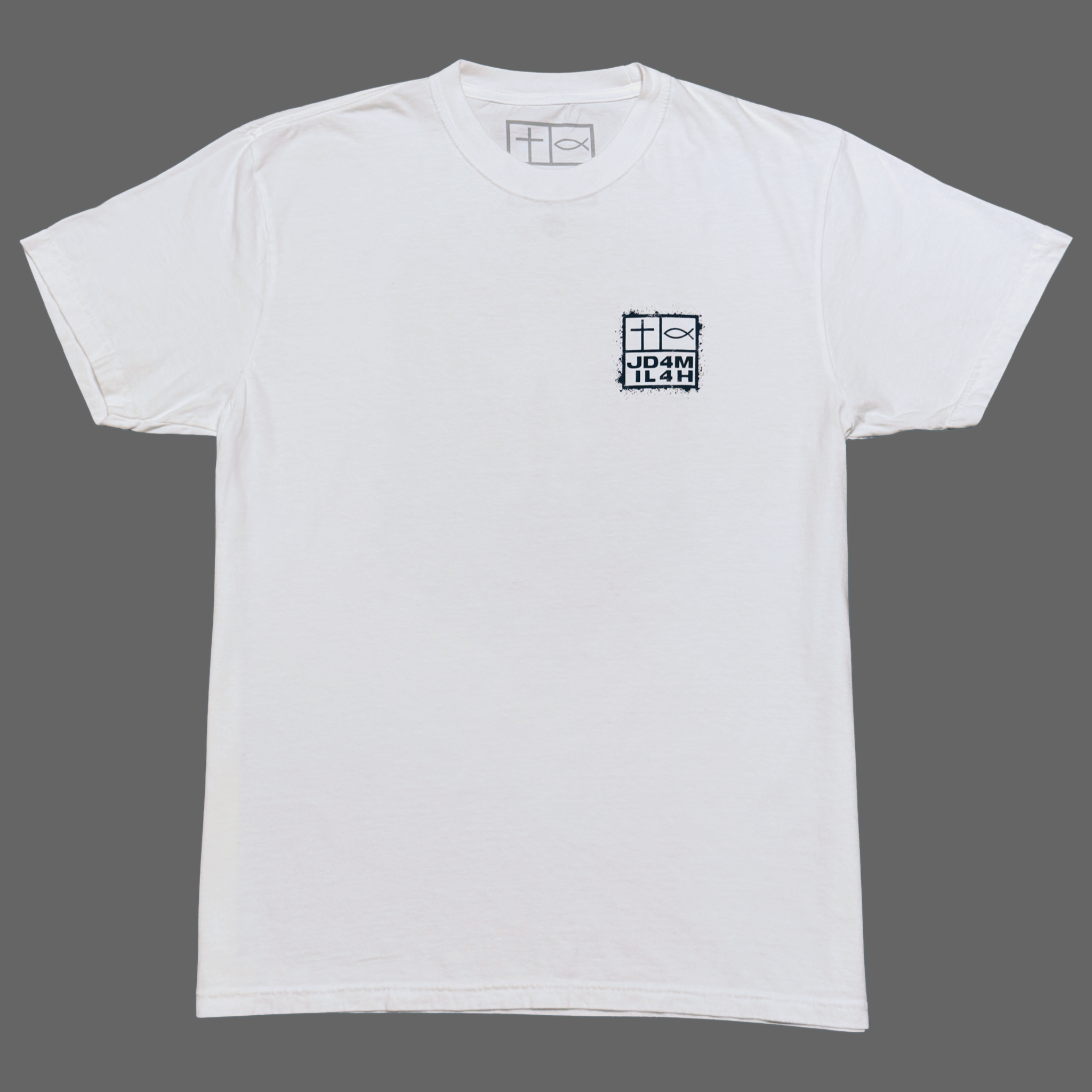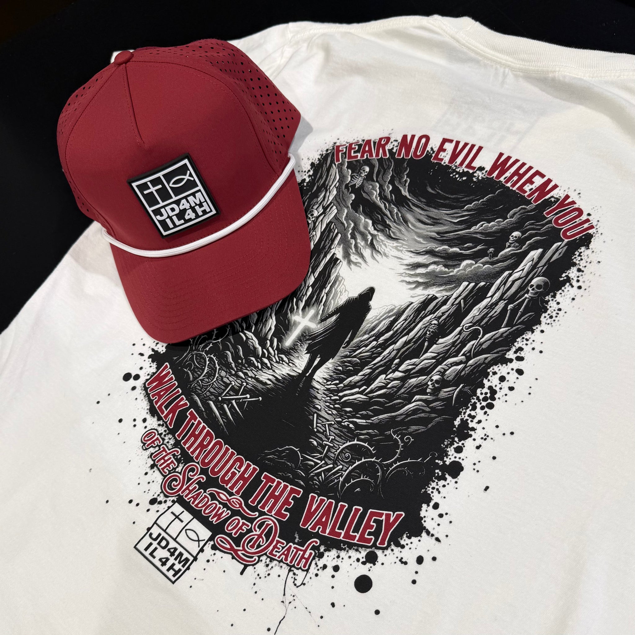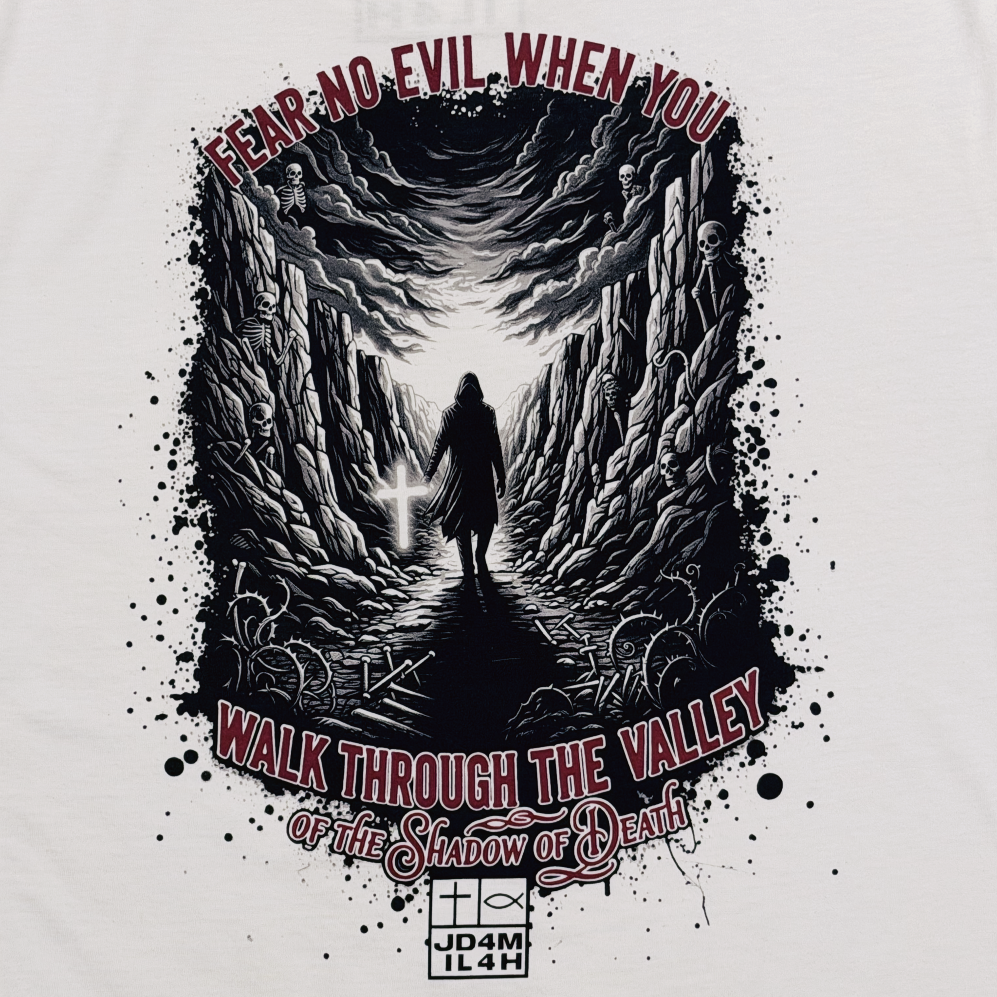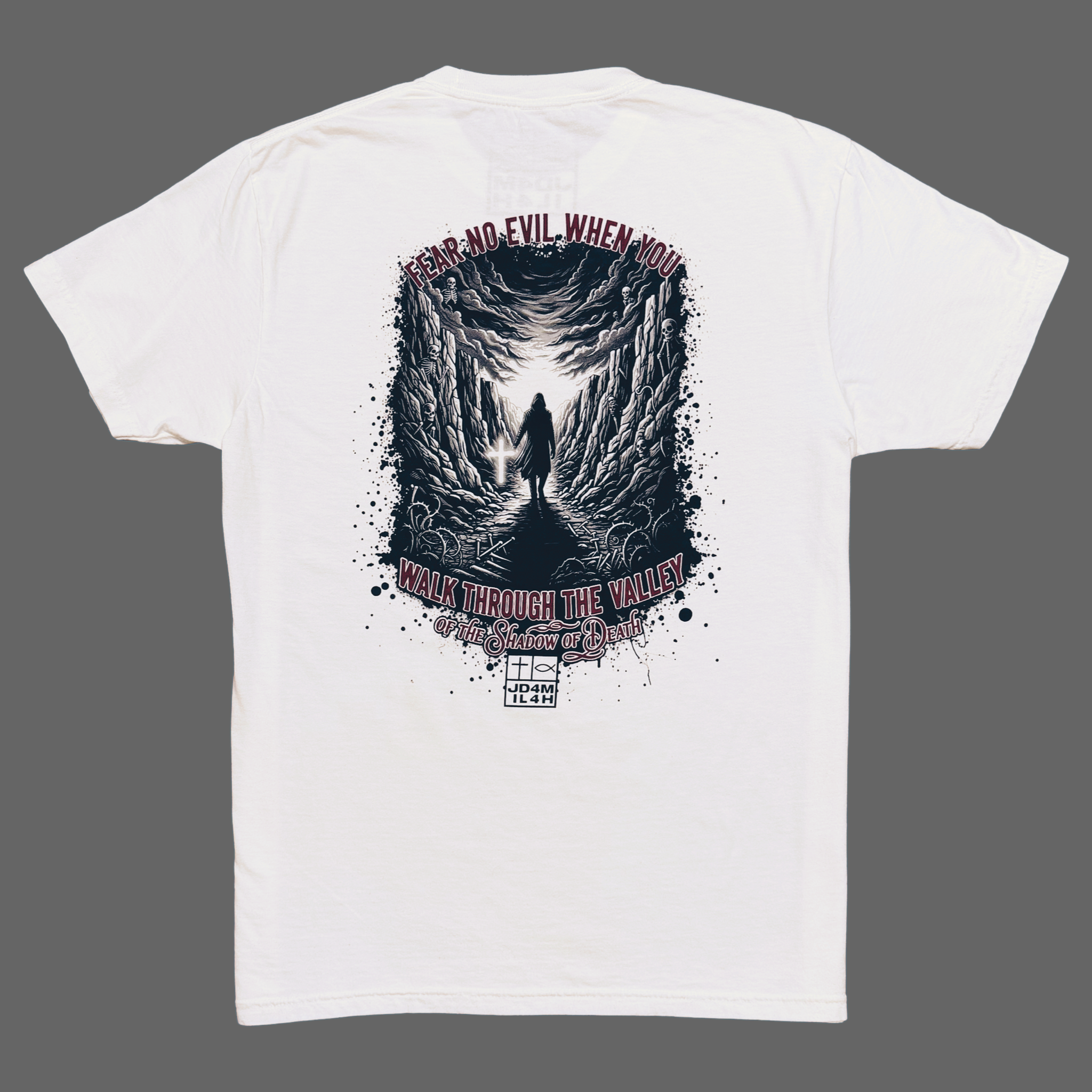 The Fear No Evil unisex, white color t-shirt shares the powerful message of “Fear no evil when you walk through the valley of the shadow of death.”  This design is to remind us that God is always with us even in the darkest of times.  This shirt features a large graphic design on the back and our logo with custom features to match the back graphic.  God is always there for us!