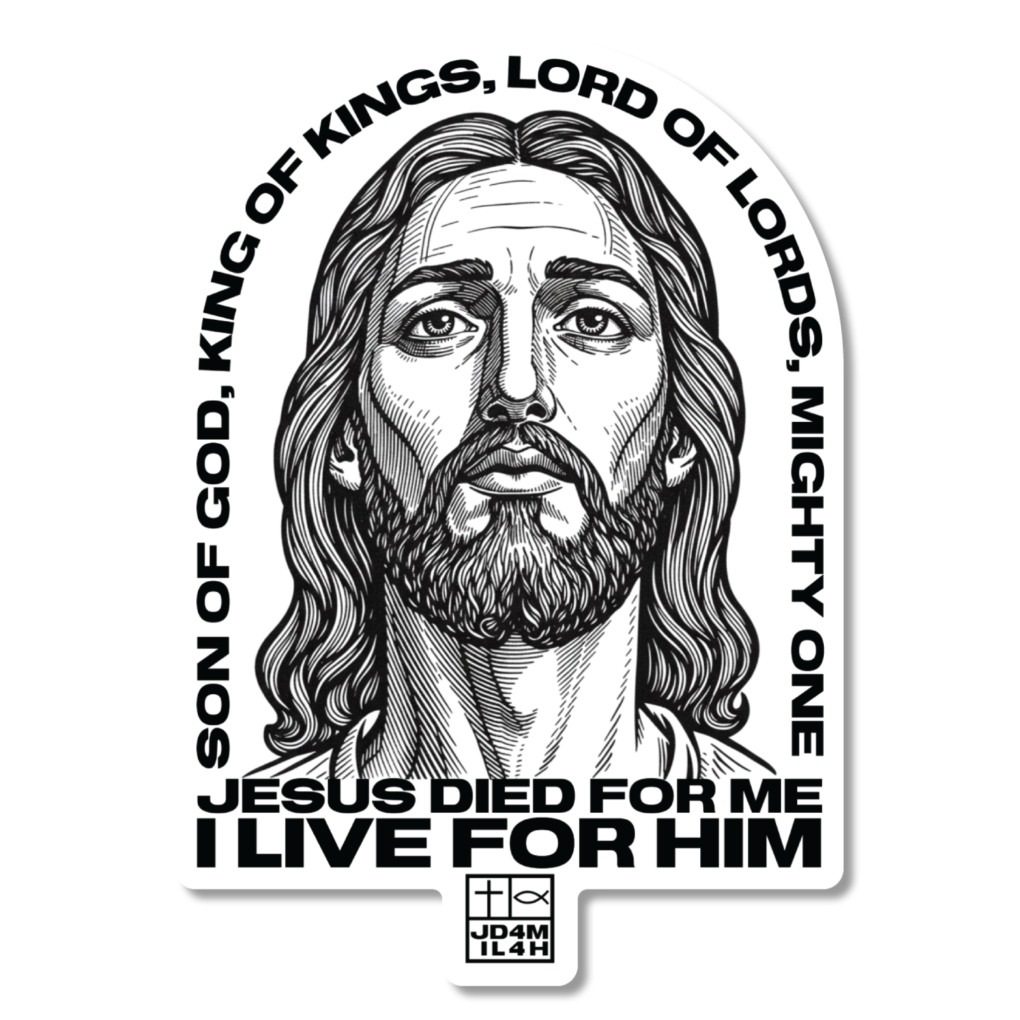The Jesus Sticker is a sticker of Jesus sharing our message and all of his great names. The sticker is a die cut sticker measuring about 3” tall and 2.11” wide. It is made of thick, durable vinyl to protect it from scratches, sunlight, and water. Stick it on your favorite items to remind you that “JESUS DIED FOR ME, I LIVE FOR HIM.” Let’s share Jesus with the world!